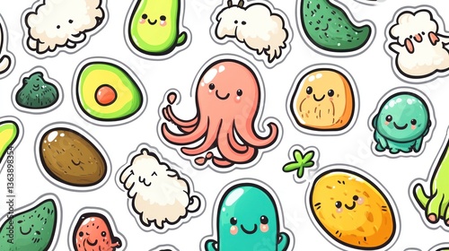 Cute food and animal stickers; playful pattern; white background; kids' design; website decoration