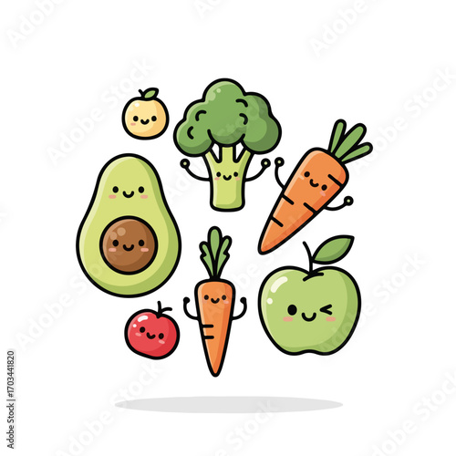 Cute food characters featuring happy apple, joyful avocado, smiling broccoli, and fun carrots. Cute food characters add charm and whimsy,