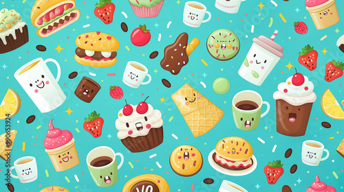 Cute food patterns on turquoise background, vector illustration with cute patterns of various snacks such as cakes, pastries and coffee cups scattered on the surface