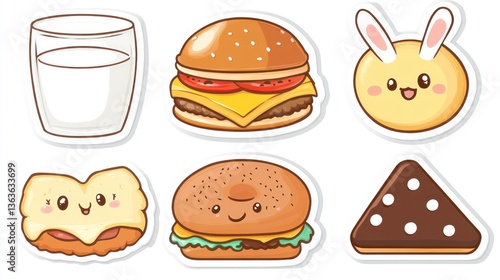 Cute food stickers burger, milk, bread, and cookies; ideal for kids' menus or websites