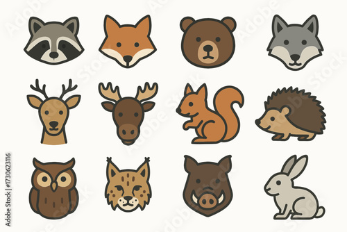 Cute forest animal icons featuring raccoon, fox, bear, wolf, and more