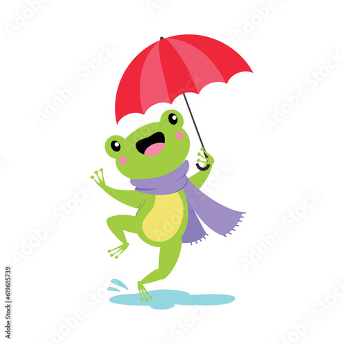 Cute Frog in Rainy Day Walking with Umbrella and Scarf Vector Illustration