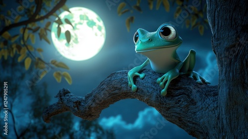 Cute frog on branch, moonlit night, forest background, children's book illustration