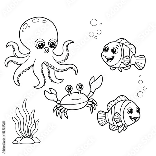 Cute funny octopus, crab and clownfish for coloring. Template for a coloring book with funny animals. Coloring page for kids.