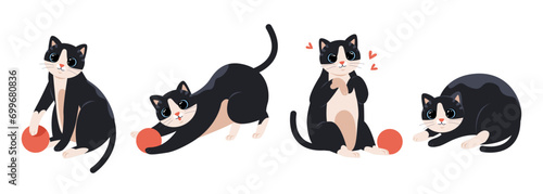 Cute funny playful black and white cat. Set of pet flat vector illustrations.
