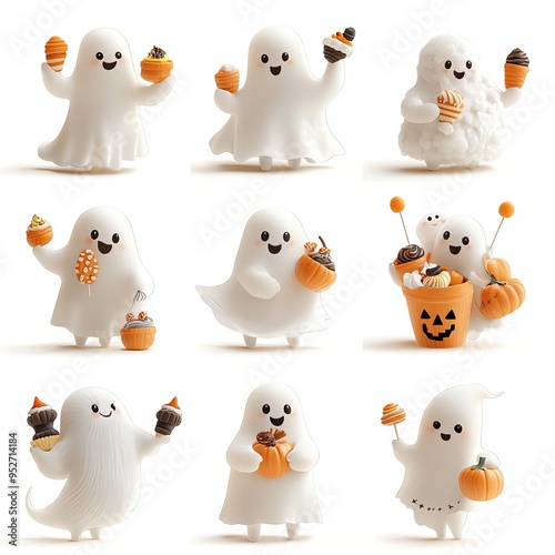 Cute ghost figures celebrating Halloween with treats and decorations in a playful display. Perfect for festive themes and designs.