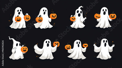 Cute ghostly characters celebrating Halloween with pumpkins in a spooky atmosphere