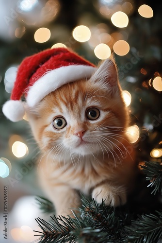 Cute ginger kitten wearing Santa hat, surrounded by festive lights.