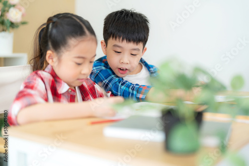 Cute girl and boy sitting in the classroom and doing homework together. Boy looking at friend on her drawing. Portrait of school kid. Learning, education and kindergarten concept. Back to school