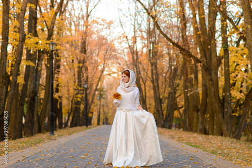 Cute girl in long white wedding dress in rural path among autumnal trees in golden hour atmosphere.