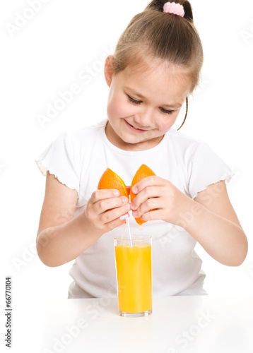 Cute girl is drinking orange juice