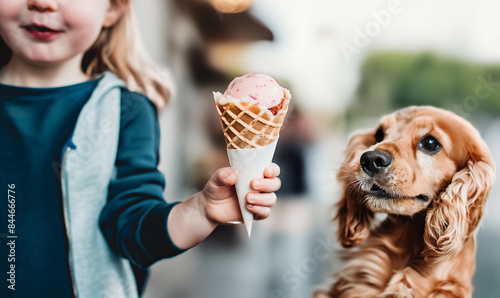 Cute girl with funny dog and strawberry ice cream close-up photograph, the pet is looking at the icy treat, the small kid is smiling, happy to be in summer vacation, enjoying the delicious snack