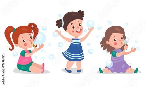 Cute Girls Playing with Soap Bubbles Vector Illustration Set