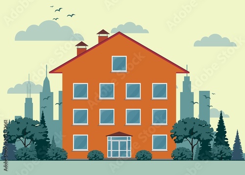 Cute graphic private houses with city landscape . Flat style vector illustration