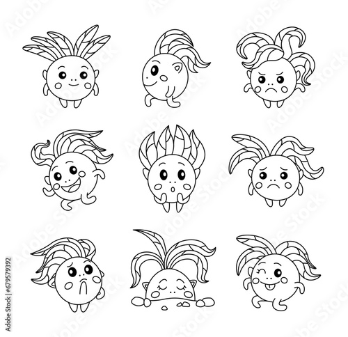 Cute grass character. Coloring Page. Kawaii plant different poses and emotions, love, joy, sadness, anger. Vector drawing. Collection of design elements.