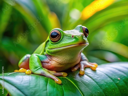 Cute Green Frog Sitting on a Leaf in a Lush Garden with Water Droplets on Its Smooth Skin