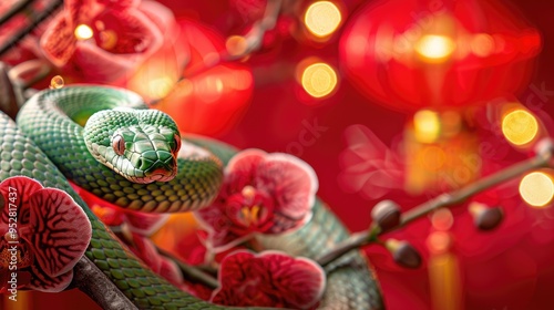 Cute green snake coiling around a blooming orchid flower under a soft glow.