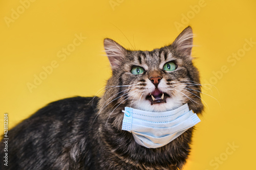 Cute grey Siberian cat with mask for protect corona virus