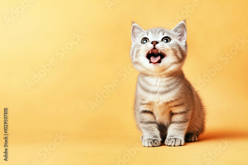 Cute grey tabby kitten on yellow background looking up with open mouth
