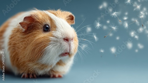 Cute guinea pig gazes curiously at dandelion seeds floating in the air in a calm indoor setting