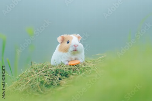 Cute Guinea Pig Sitting on a Grass Patch with Carrot Snack