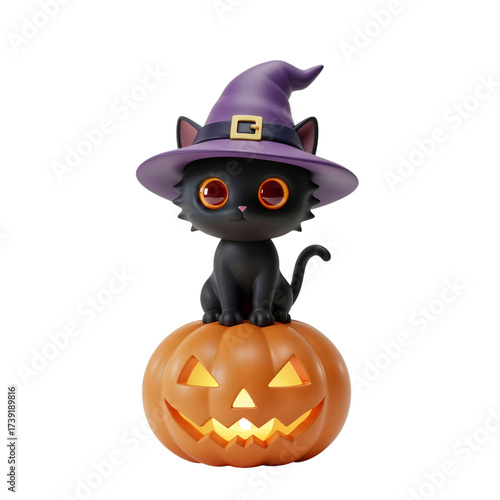 Cute halloween black cat wearing witch hat sits on glowing jack o lantern pumpkin decoration isolated on transparent background