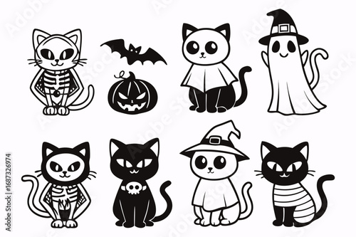 Cute Halloween Cats in Costumes Clipart – Skeleton, Witch, Mummy, Pumpkin Cat Illustrations