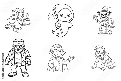 Cute Halloween Characters Vector Set, Witch, Grim Reaper, Scarecrow, Frankenstein, Vampire, Zombie