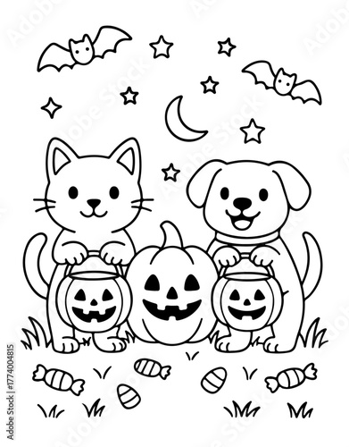 Cute Halloween Coloring Page with Cat, Dog, and Jack-o'-Lanterns