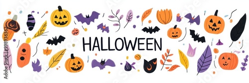 cute Halloween elements and icons with text "HALLOWEEN" Isolated on white background Generative AI