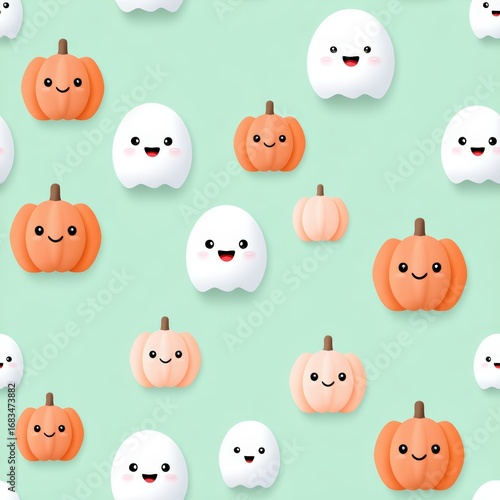 Cute Halloween Pattern with Ghosts and Pumpkins on Light Green Background