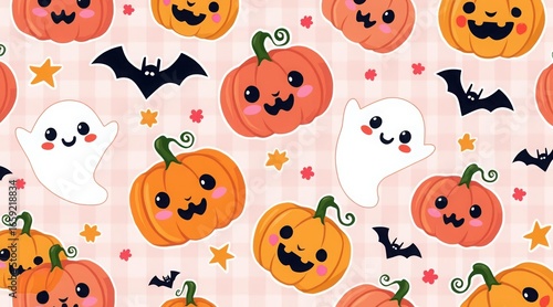 Cute halloween pattern with pumpkins, ghosts, and bats on a pink background