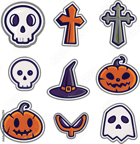 Cute Halloween Stickers with Skull Pumpkins Crosses Witch Hat and Ghost