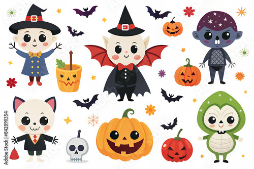 Cute Halloween-themed illustration with characters like a witch, bats, pumpkins, and more on a light background.