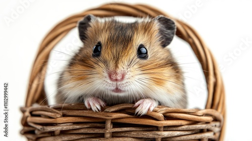 Cute hamster sitting in a woven basket against a clean white background creating an adorable and playful atmosphere for pet imagery