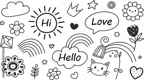 cute hand drawn doodle vector set, love, Natural , firework, cloud, weather, rainbow, snow, heart. a seamless doodle vector illustration filled with cute and playful hand-drawn elements in black outli