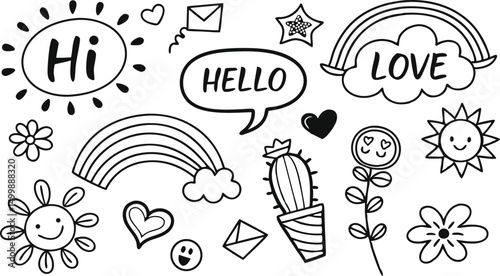 cute hand drawn doodle vector set,a seamless vector doodle illustration in black and white. love, Natural , firework, cloud, weather, rainbow, snow, heart and creative design vector collection.