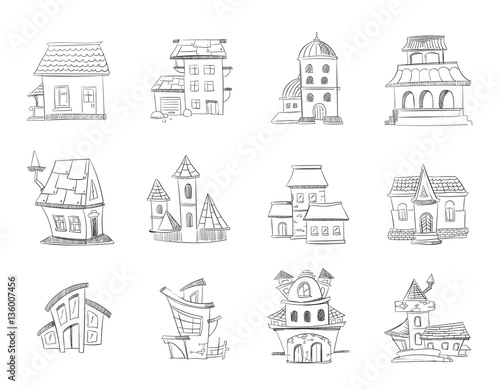 Cute hand drawn houses with windows, doodle housing, sketchy homes vector set
