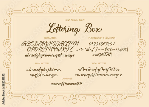 Cute hand drawn vintage vector alphabet ABC font with letters, numbers, symbols. For calligraphy, lettering, hand made quotes.