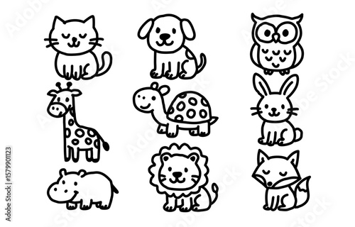 Cute hand-drawn animal doodle set. Black and white cartoon line art of various animals including cat, dog, owl, giraffe, turtle, rabbit, hippo, lion, and fox. Perfect for kids’ design, sticker, colori