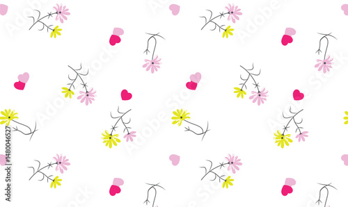 "Cute Hand-Drawn Floral and Heart Seamless Pattern with Pink and Yellow Flowers – Romantic Spring Background"