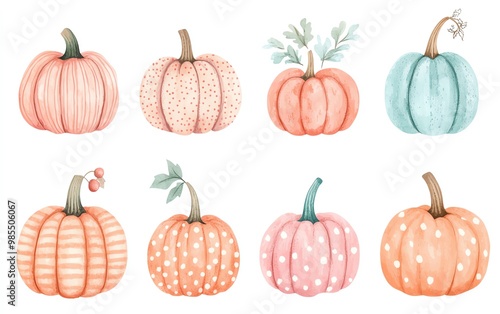 Cute handdrawn pumpkins featuring pastel stripes, polka dots, and chevron patterns, in pink, mint, light blue, and orange, with varied textures, on a solid white background
