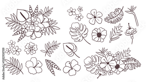 Cute hand-drawn tropical flowers and composition doodle set, perfect for decorating surfaces, prints and crafting projects. A total of 22 items. Vector illustration.