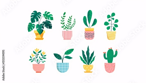 Cute Illustrated Houseplants Collection. Set of Potted Indoor Plants for Home Decor and Greenery Designs.