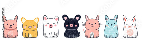 Cute illustration featuring a row of cartoon rabbits and mice, each with unique expressions and colors, perfect for kids and animal-themed designs.