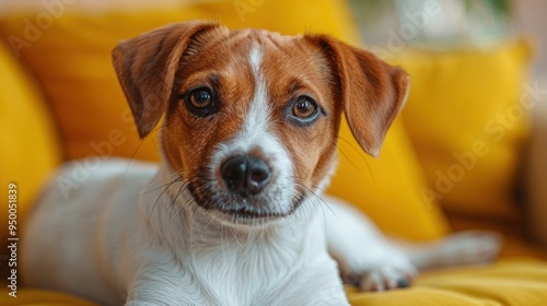 Cute Jack Russell Terrier Puppy Poses for Funny Studio Portrait on Yellow Background