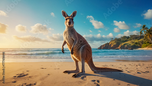 Cute kangaroo on the beach, ocean shore