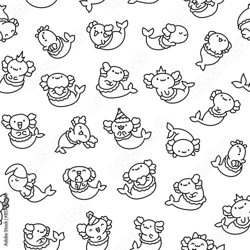 Cute kawaii axolotl mermaid. Seamless pattern. Coloring Page. Cartoon fantasy animal characters. Hand drawn style. Vector drawing. Design ornaments.