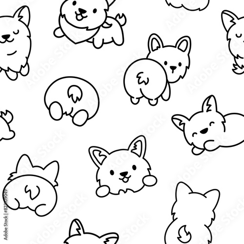 Cute kawaii corgi dog. Seamless pattern. Coloring Page. Funny puppy cartoon animal characters. Hand drawn style. Vector drawing. Design ornaments.