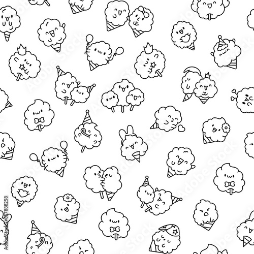 Cute kawaii cotton candy with a smile. Seamless pattern. Coloring Page. Sweet sugar cartoon food character. Hand drawn style. Vector drawing. Design ornaments.